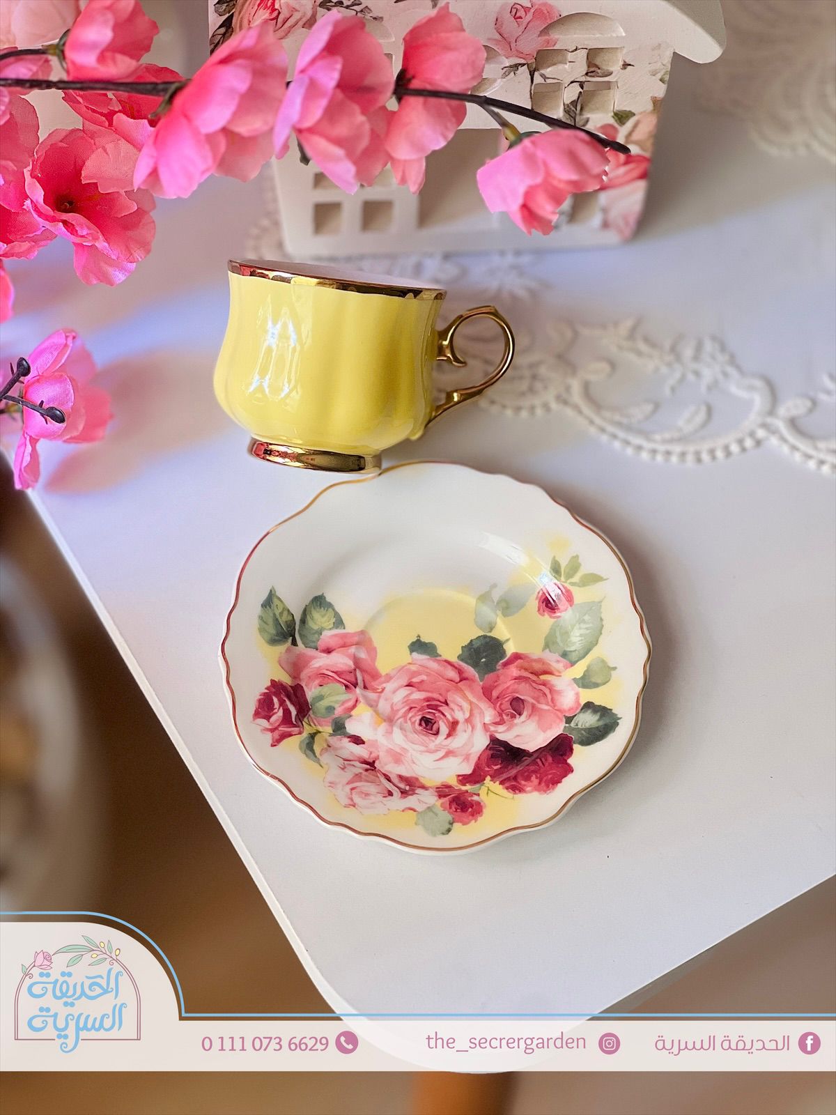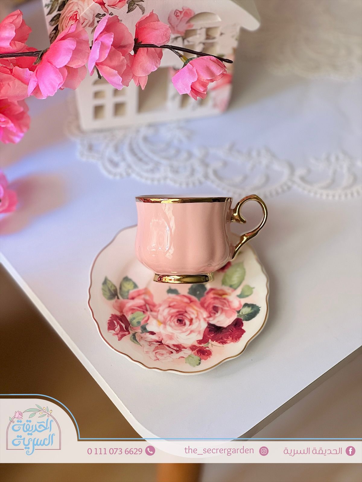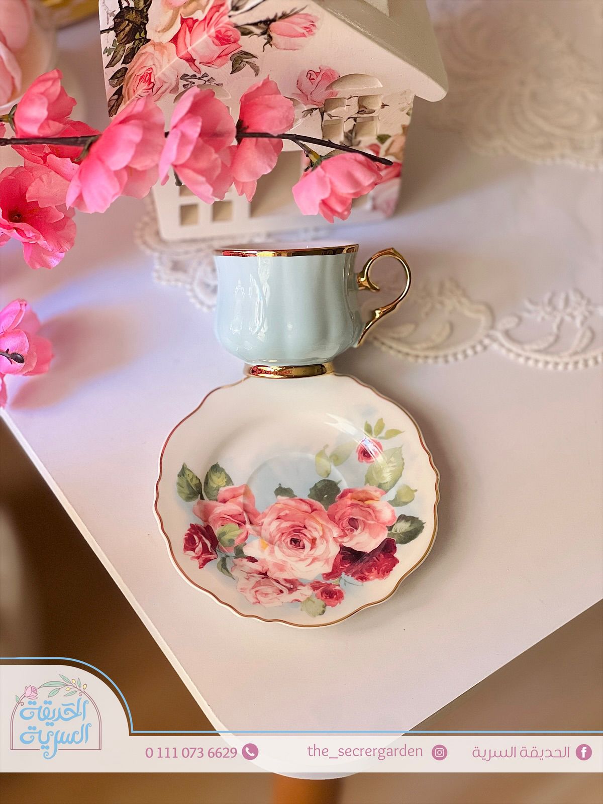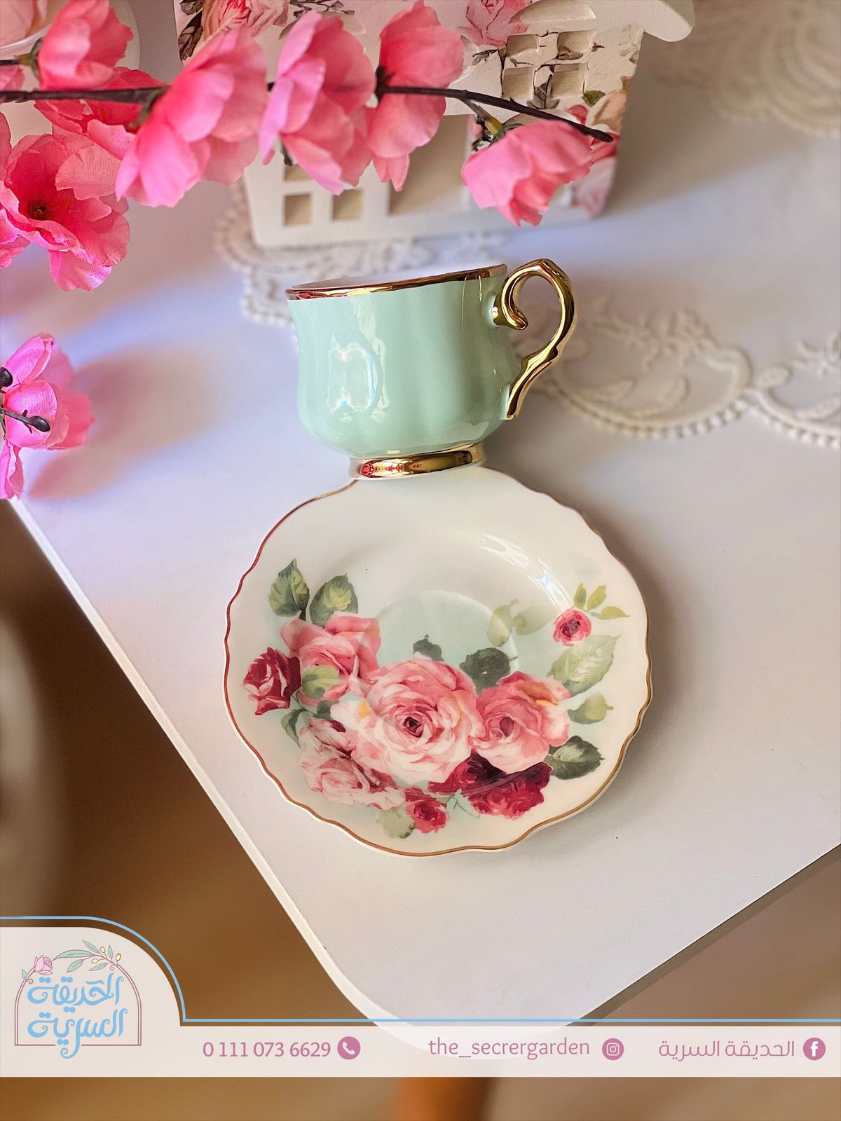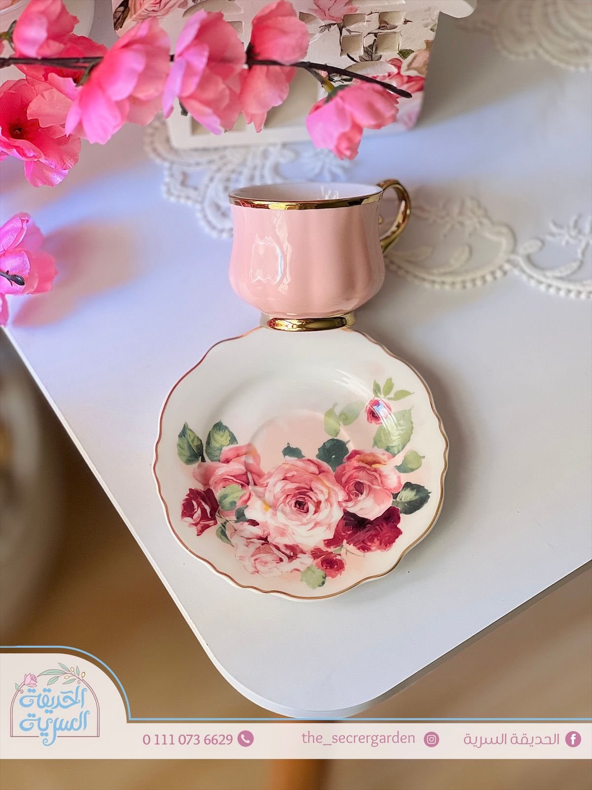 فنجان قهوة بطبق ورد